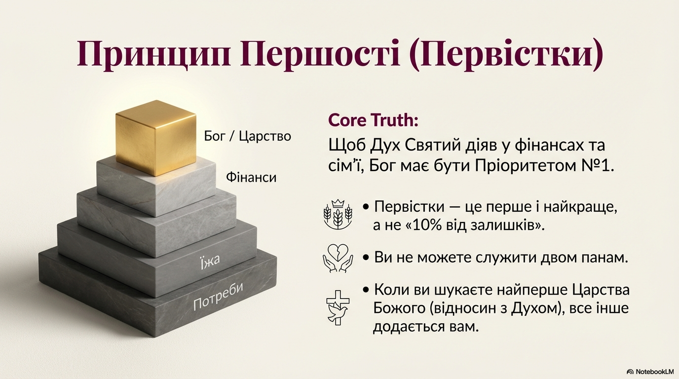У Старому Завіті люди приносили Богу первістки — перше і найкраще, а не «10% від залишків». Щоб Дух Святий діяв у ваших фінансах та сім’ї, Бог має бути Пріоритетом №1.