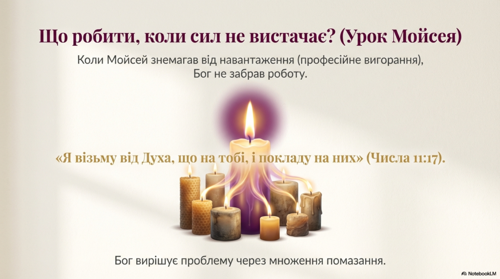Пригадайте історію Мойсея. Коли він знемагав від навантаження (професійне вигорання), Бог не прибрав людей. Бог сказав: