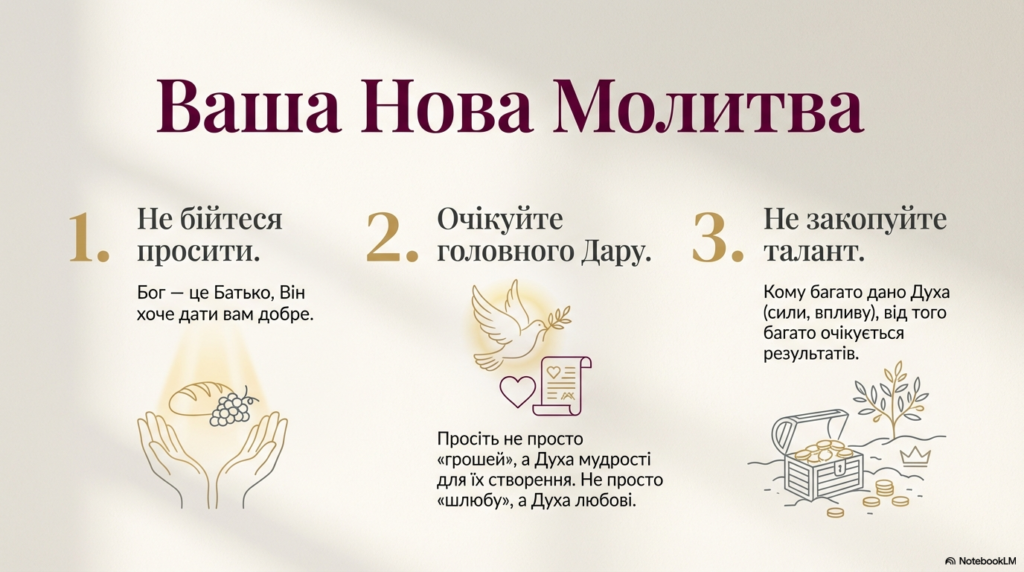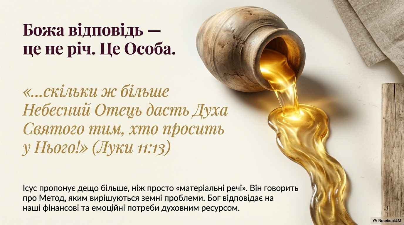 Але якщо ми уважніше вчитаємося в контекст цих слів у Євангелії від Луки, то побачимо, що Ісус пропонує дещо значно більше, ніж просто «матеріальні речі». Він говорить про Метод, яким Бог вирішує наші земні проблеми. І цей метод — Святий Дух.