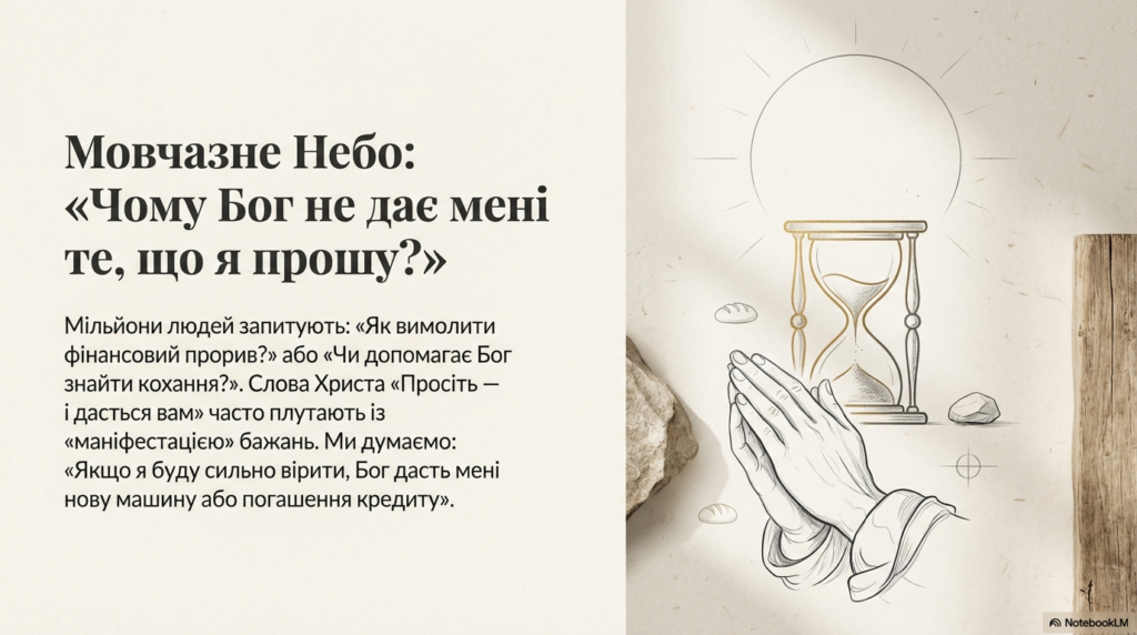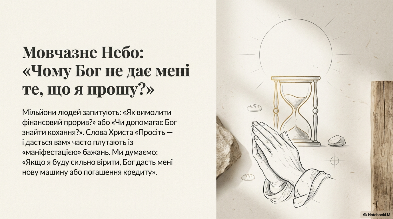 Ці питання хвилюють мільйони людей. Ми знаємо слова Христа: «Просіть — і дасться вам; шукайте — і знайдете; стукайте — і відчинять вам». У сучасному світі їх часто сприймають як формулу «маніфестації» бажань або «закон тяжіння». Люди думають: «Якщо я буду сильно вірити, Бог (або Всесвіт) дасть мені нову машину, погашення кредиту чи ідеального партнера».