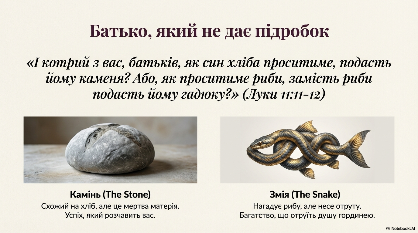 Часто ми просимо у Бога речі, які нам здаються «хлібом» (наприклад, виграш у лотерею), але Бог знає, що для нашого характеру зараз це стане «каменем», який нас розчавить, або «змією», яка отруїть нашу душу гординею.