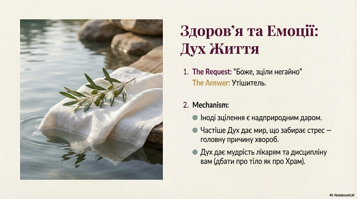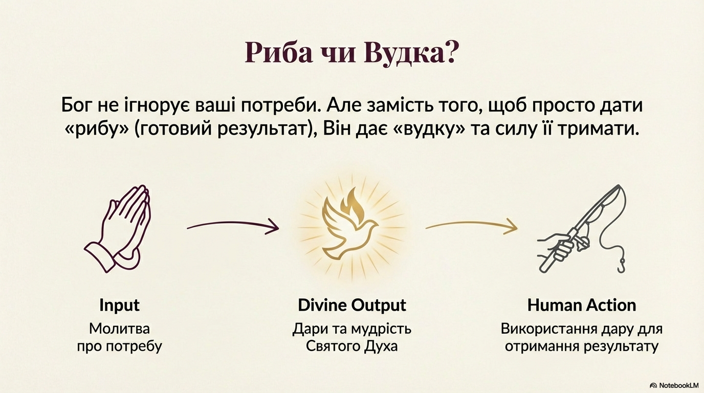 Бог не ігнорує наші потреби. Але замість того, щоб дати «рибу», Він часто дає «вудку» та силу її тримати. Ця «вудка» — це дари та мудрість Святого Духа.