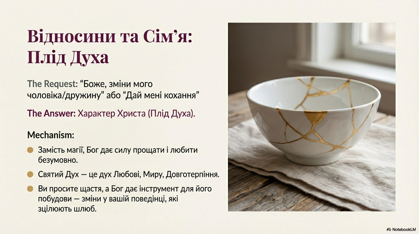 Ми часто молимося: “Боже, зміни мого чоловіка/дружину” або “Дай мені кохання”. Бог відповідає, даючи Плід Духа.
